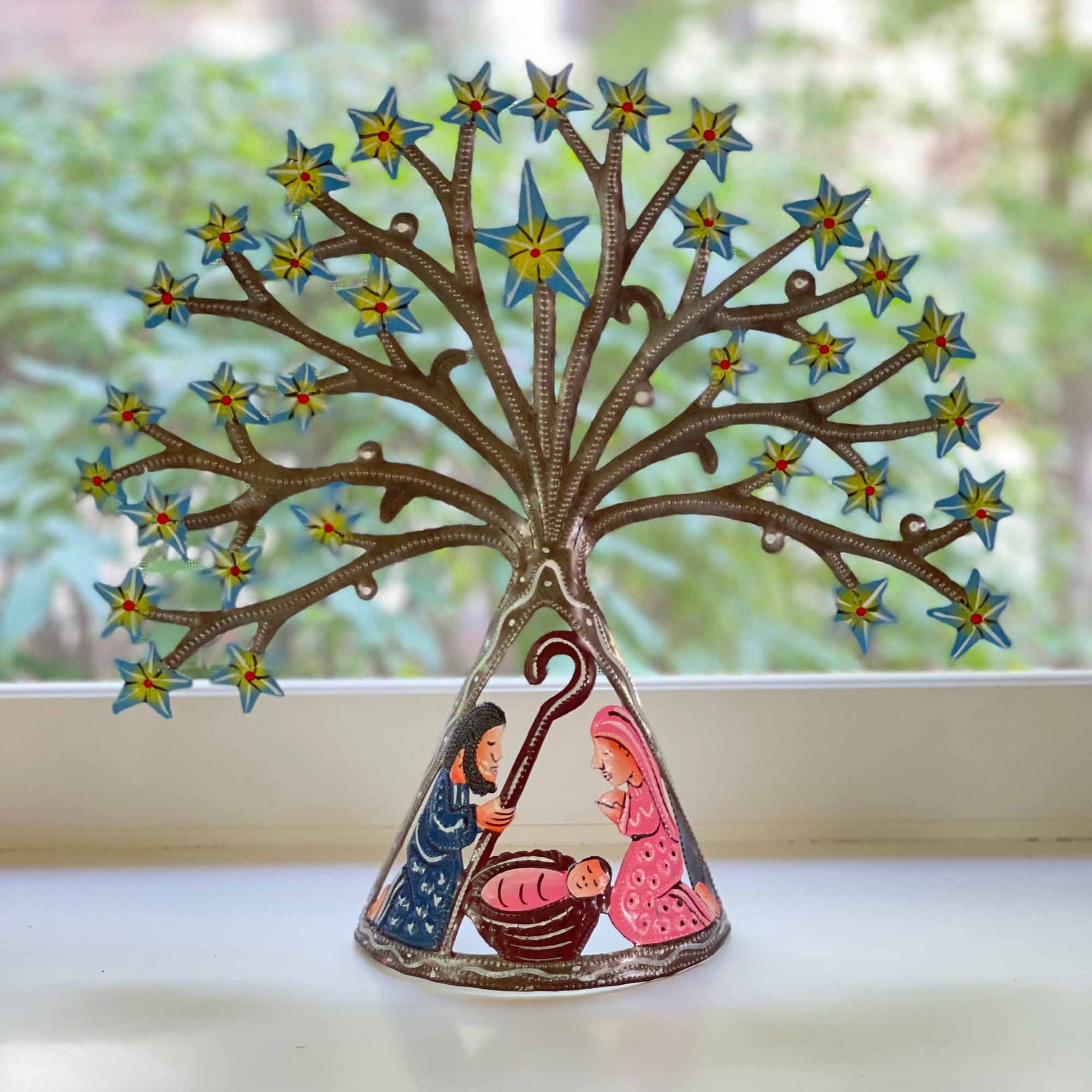 Este belén de mesa único combina la historia navideña con un toque cultural de Haití. El artesano representa el belén bajo una noche estrellada. Meticulosamente elaborado a mano, mide 11 pulgadas de alto. Elaboradas a partir de tambores de acero reciclados de 55 galones por artesanos de aldeas en Haití, ¡estas impresionantes obras de arte son verdaderamente únicas! El proceso de convertir láminas de metal en hermosas obras de arte se realiza a mano. Se cortan tambores de acero utilizados para transportar petróleo a la capital de Haití, el petróleo se quema para limpiar el metal y luego se aplana para crear un impresionante arte reciclado. Tipo: Decoración de mesa de metal Colores: Pintado Materiales: Acero reciclado Dimensiones del metal: Aprox. 11 pulgadas de alto Cuidado: Limpiar con un paño suave. Dada la naturaleza hecha a mano de este producto, permita variaciones menores. A medida que el metal se recupera de bidones de petróleo reciclados y se colorea mediante un proceso de combustión, su coloración variará ligeramente. Normalmente la pieza tiene una pátina de acero oscurecida. Cada obra de arte está recubierta con una capa de capa transparente para ayudar a proteger el metal.
