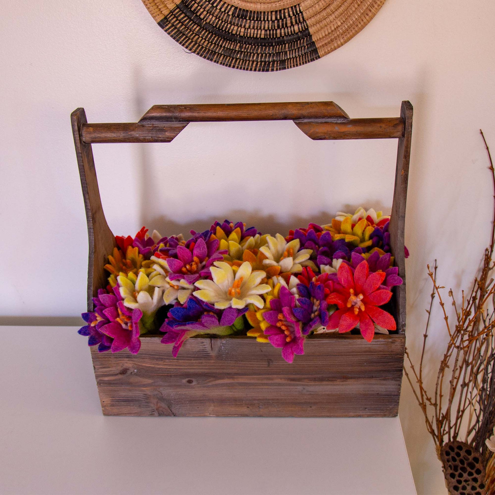 This beautiful bouquet of five flowers is lovingly hand-crafted by mother and sister artisans in Nepal. Each flower is colorful and very detailed down to the stigma. Tied together and finished off with a sweet felt heart. This makes the perfect gift that lives on forever.
