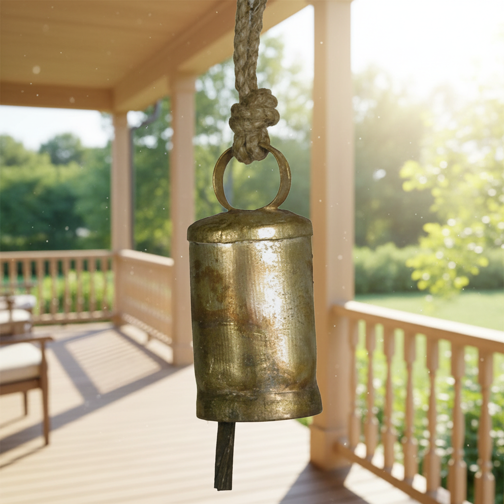 Instrumento musical y acento decorativo en uno, esta campana de forma cilíndrica ha sido hecha a mano con chatarra reciclada por los artesanos del taller patrocinado por el Arca de Noé en Moradabad, India.