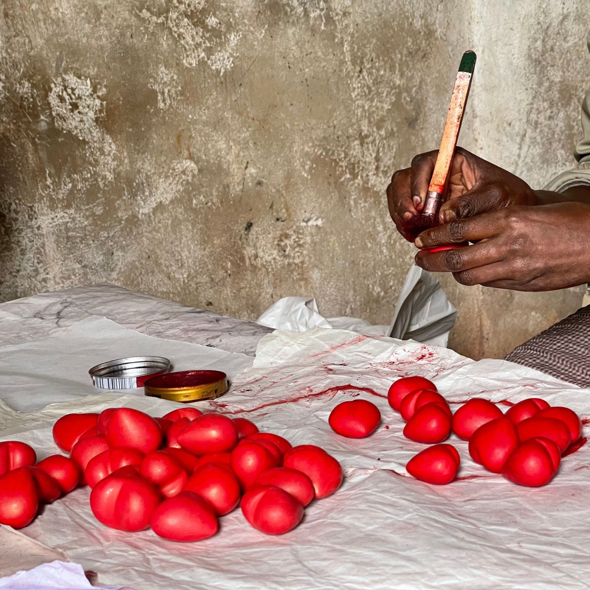 Nuestra esteatita está tallada por los artistas de SMOLArt, un grupo de artistas que viven en la aldea rural de Tabaka, Kenia, el corazón de la región de tallado de esteatita de Kenia. El nombre, una versión abreviada de Artistas pequeños, medianos y grandes, se refiere al tamaño de los productos de esteatita que fabrican los artesanos, no a su estatura. Fundada en 1990, SMOLArt es miembro de la WFTO y, como tal, garantiza que los artesanos reciban un precio justo por su trabajo. Además, la organización apoya el desarrollo comunitario contribuyendo a proyectos que mejoran las condiciones de vida, la educación y la salud de sus miembros y de la aldea en general.La esteatita se extrae de grandes pozos en los alrededores de Kiisi, Kenia. La esteatita extraída se entrega luego a talladores que tallan esculturas de piedra natural para el mercado mayorista, cuyo color varía del crema al rosa, al marrón, al amarillo, al negro y hasta un veteado de todos ellos. Una vez tallada, los artesanos alisan los bordes ásperos de la esteatita con papel de lija humedecido en agua y pulen la pieza hasta obtener un alto brillo o pintan motivos africanos en colores brillantes con detalles grabados.