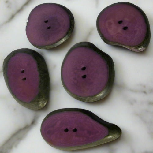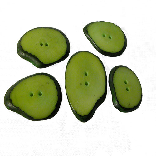 Each Tagua button is one of a kind. They come from a rainforest nut known as Tagua, a.k.a. "Vegetable Ivory". It has a likeness to animal ivory but causes no harm to the rainforest or animals. Natural tagua buttons handmade in Ecuador and fair trade imported.