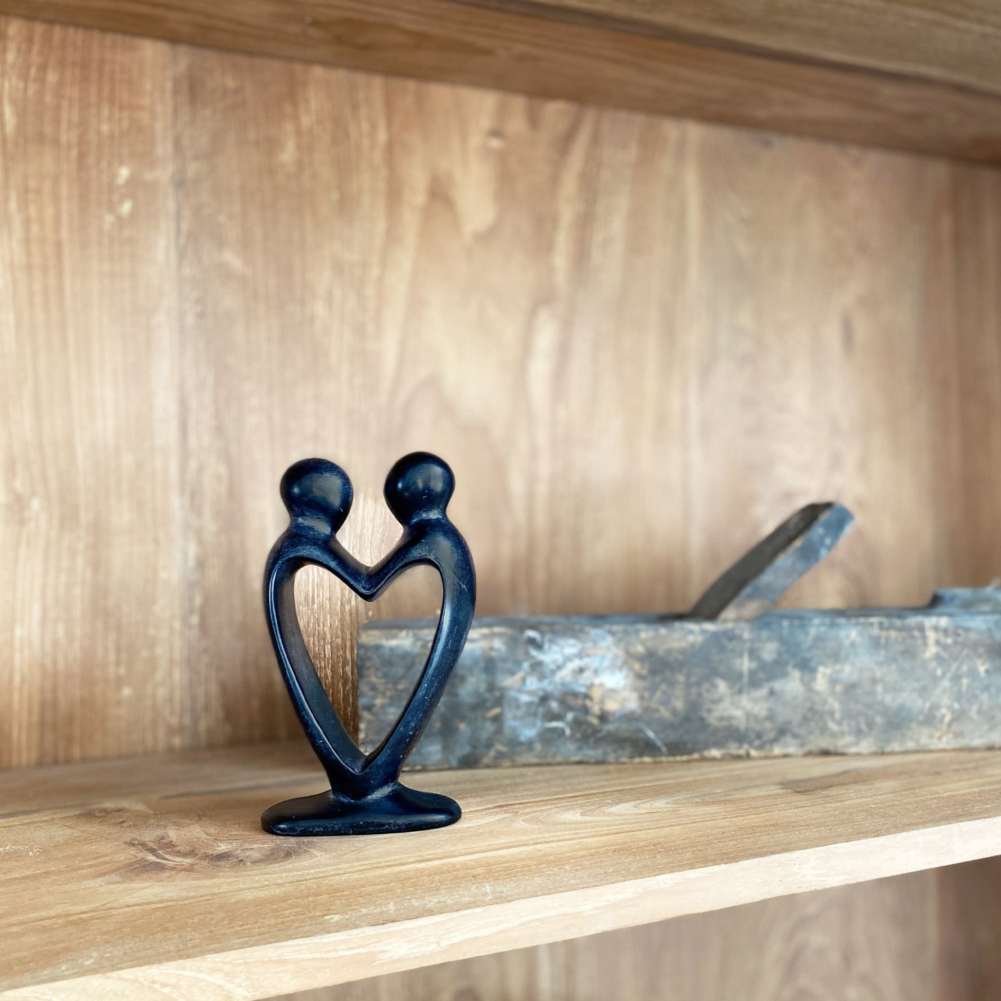 Handcarved from soapstone, this unique sculpture represents two lovers in the shape of a heart. Measures 8 inches tall.