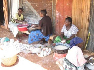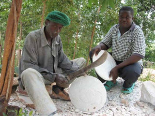 Soapstone is mined from great pits in the area surrounding Kiisi, Kenya. The mined soapstone is then delivered to carvers who hand carve sculptures from the natural stone for the wholesale market, the color of which ranges from warm cream to pink, to brown, to yellow, to black, to a marbling of all of them. Once carved, the craftspeople smooth the rough edges of the soapstone with sandpaper dipped in water and polish the piece to a high gloss or paint on African motifs in brilliant colors with etched accents.